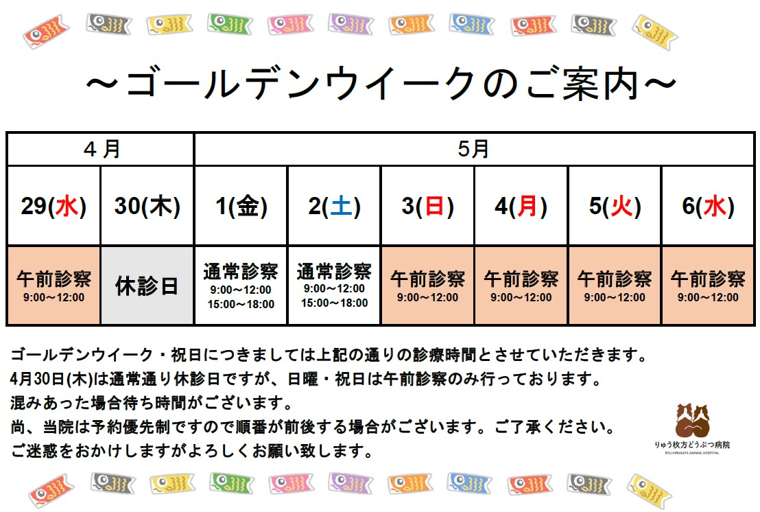 ゴールデンウィークの診察時間のご案内 2026.04.08 いつもりゅう枚方どうぶつ病院をご利用いただき、ありがとうございます。 桜も散りつつあり、ゴールデンウイークももうすぐということで 当院のゴールデンウイークの予定をご案内します。 4/30(木)は休診日となっております。 5/1(金)と5/2(土)は通常診察です。 4/29(水)、5/3(日)、5/4(月)、5/5(火)、5/6(水)は午前診察(9:00~12:00)で対応させていただきます。 可能な限り対応させていただきますのでよろしくお願い致します。