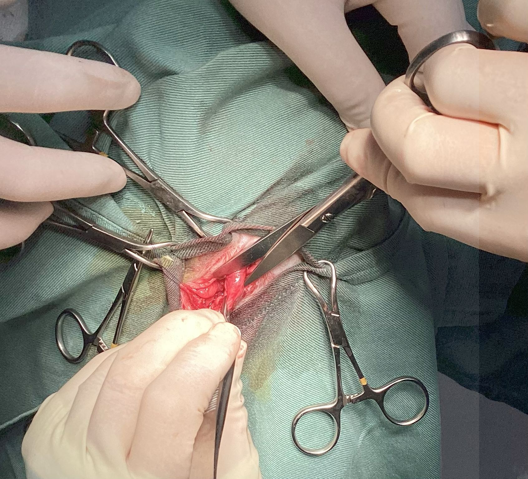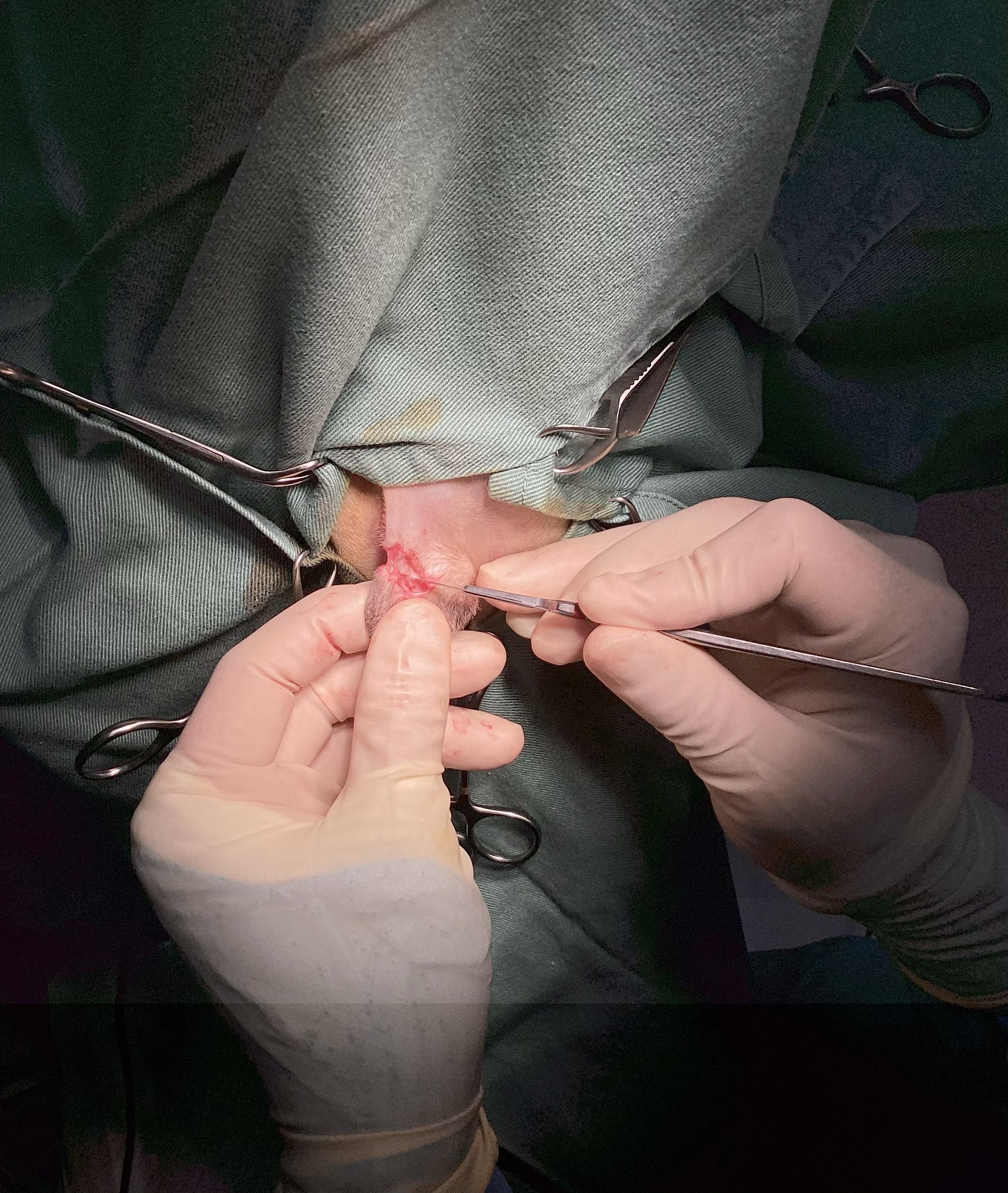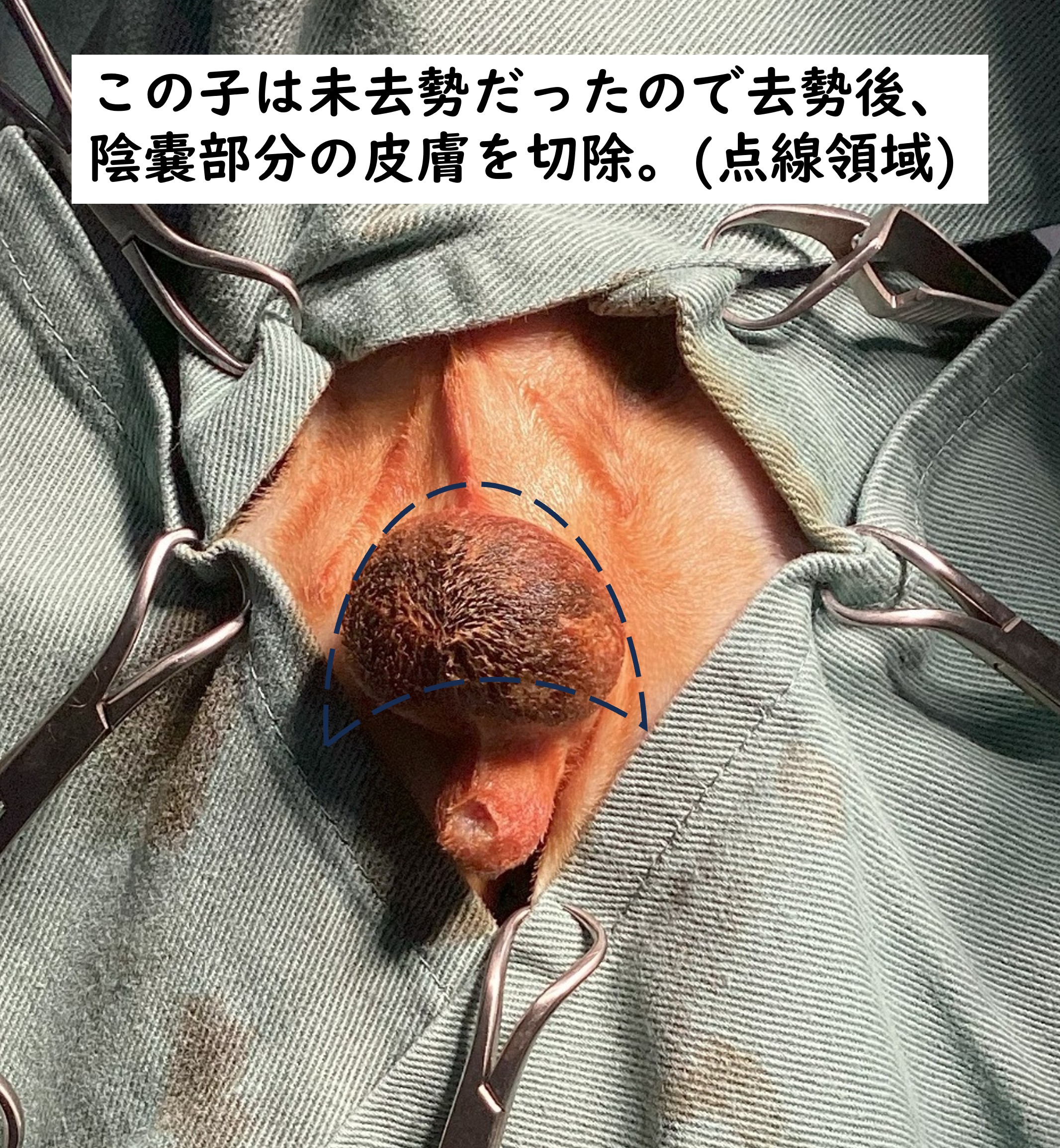 あらかじめ設置していた尿道カテーテルで陰茎を確認しながら陰茎を包皮から引き抜く。陰茎の分離が出来たら陰茎を周囲の組織から分離し、陰茎の根元の坐骨海綿体筋を切除。