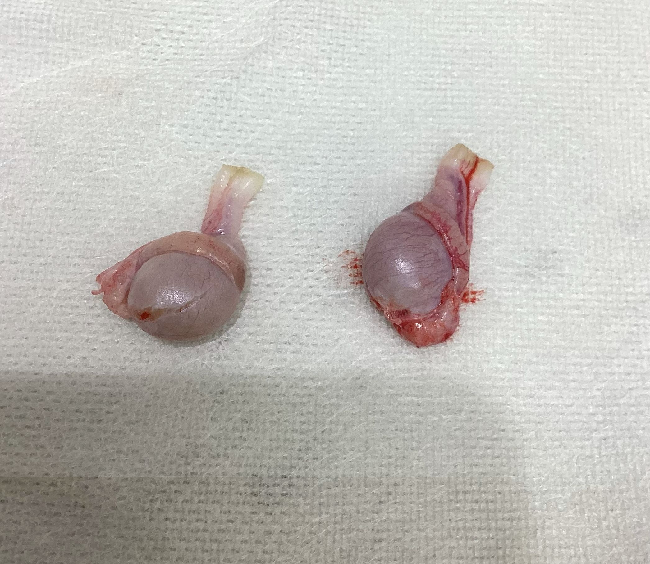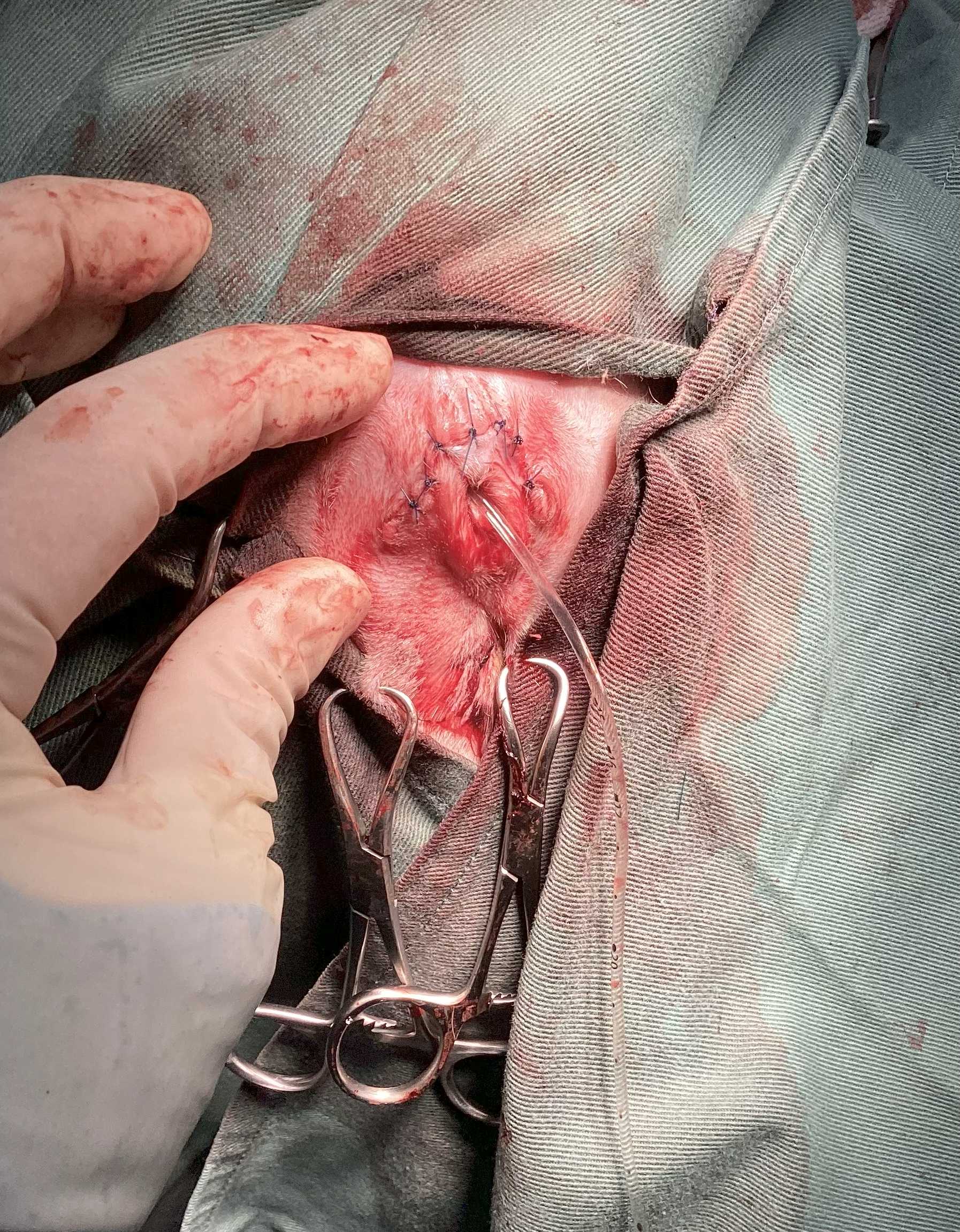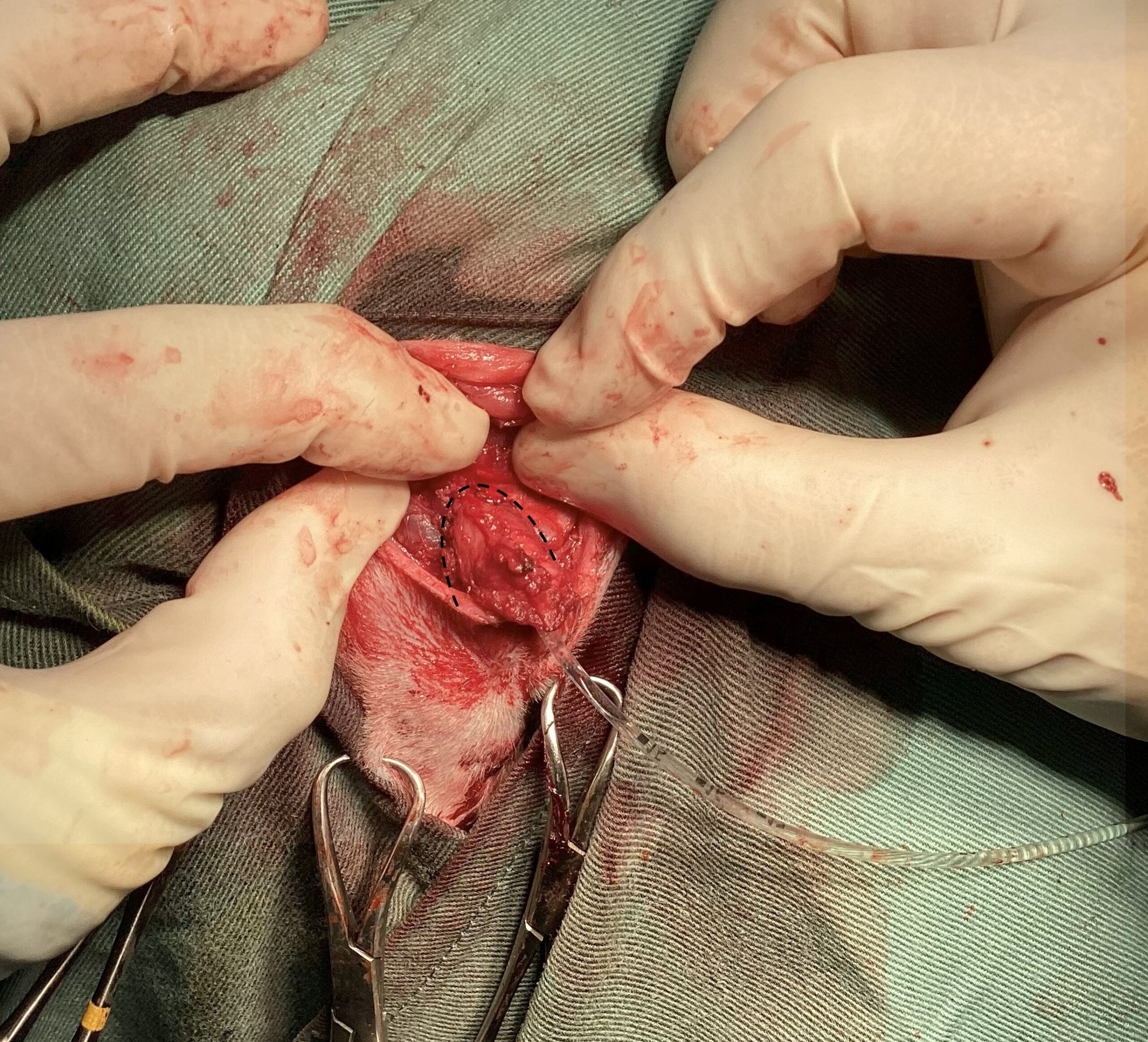 あらかじめ設置していた尿道カテーテルで陰茎を確認しながら陰茎を包皮から引き抜く。陰茎の分離が出来たら陰茎を周囲の組織から分離し、陰茎の根元の坐骨海綿体筋を切除。