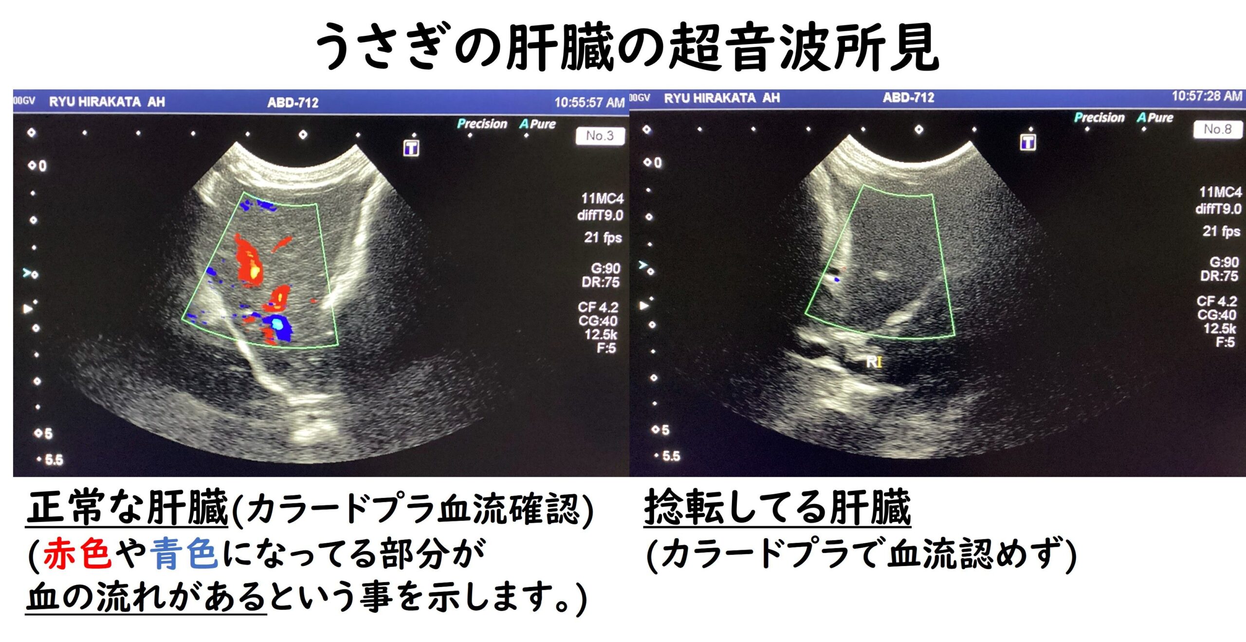 超音波検査では一部の肝臓領域で血流の確認が認められませんでした。