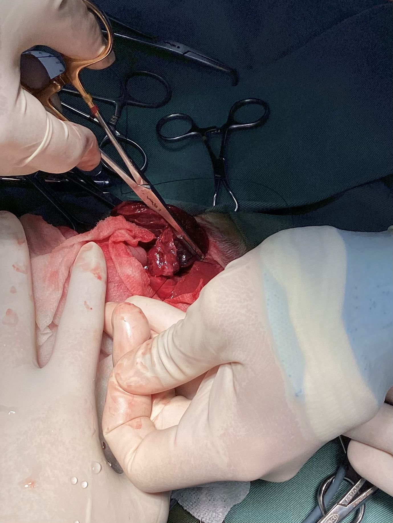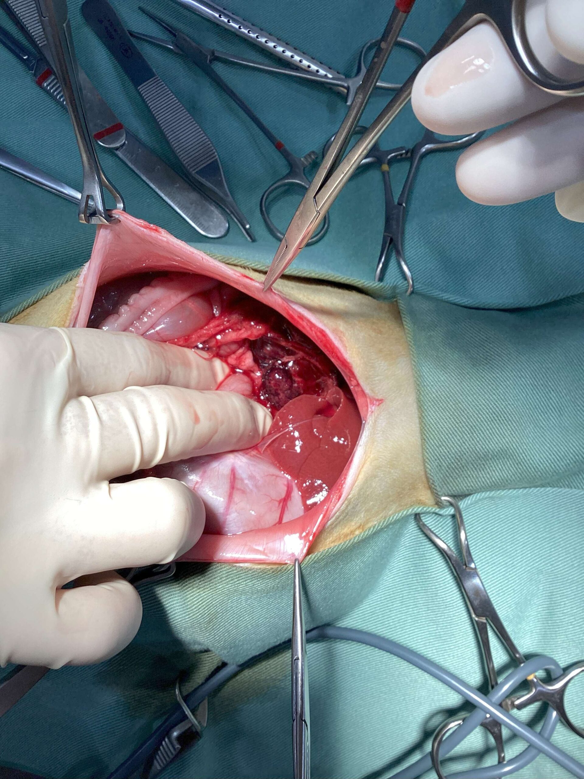 開腹時、肝臓の状態を確認すると肝臓の色が悪くなってる部分を発見しました。