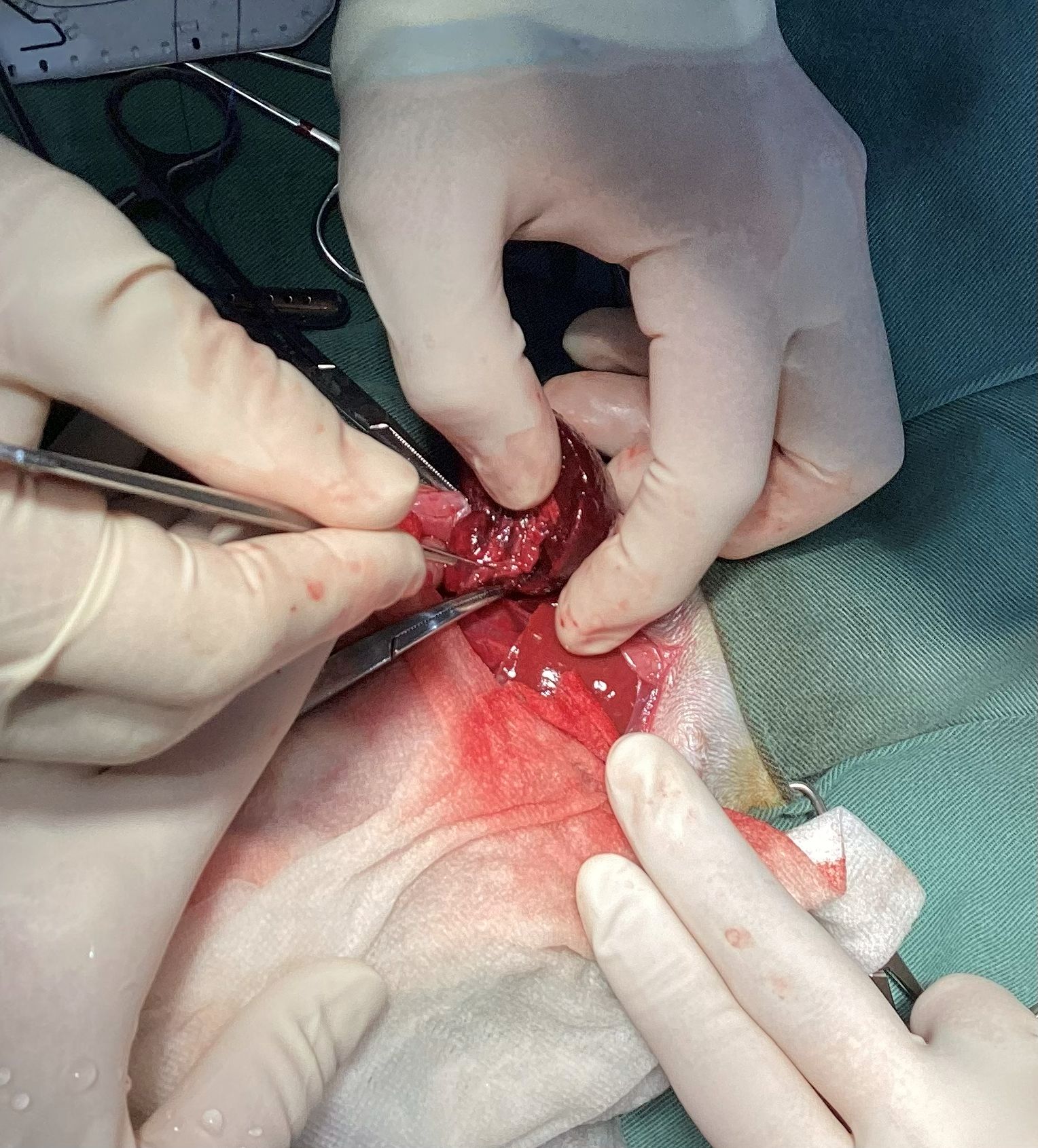 慎重に出血部位や肝臓の根元を確認して肝葉の根元で縫合糸をかけて結紮します。